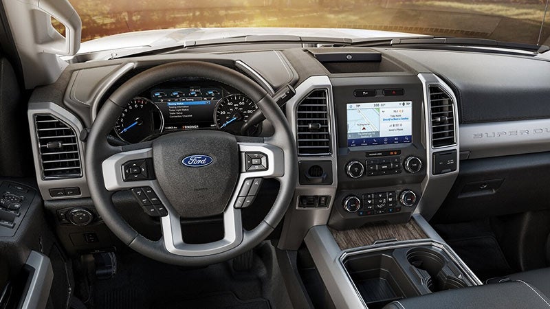 With a sleek dash design and a functional layout, fashion and function coexist inside the Super Duty. Its interiors boast comfortable settings with simple controls such as a tachometer, and an overhead console. A large center console bin stands out among Super Duty's numerous compartments and multipurpose trays on models with bucket seats. With a secure box under the rear seat, the crew cab takes storage a notch further. Both SYNC and FordPass keep you connected, so you can feel set for the road ahead.